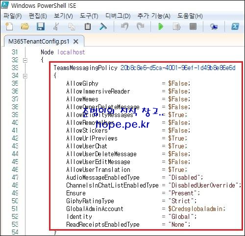 'M365TenantConfig.ps1' 파일에 TeamsMessagingPolicy 세부 설정이 내보내져 있음을 확인할 수 있습니다.
