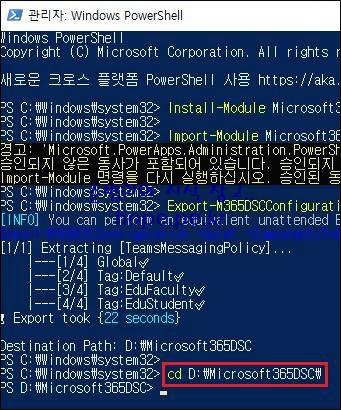 'cd 'D:\Microsoft365DSC\' 명령어를 실행하여, 설정을 내보내기 한 경로를 이동 합니다.
