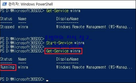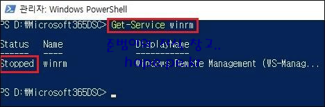 다시 'Get-Service winrm' 명령어를 실행해 winrm 서비스 실행 여부를 확인합니다.