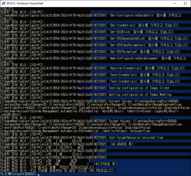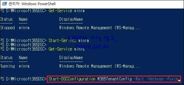 다시 'Start-DSCConfiguration M365TenantConfig -Wait -Verbose -Force' 명령어를 실행 합니다.