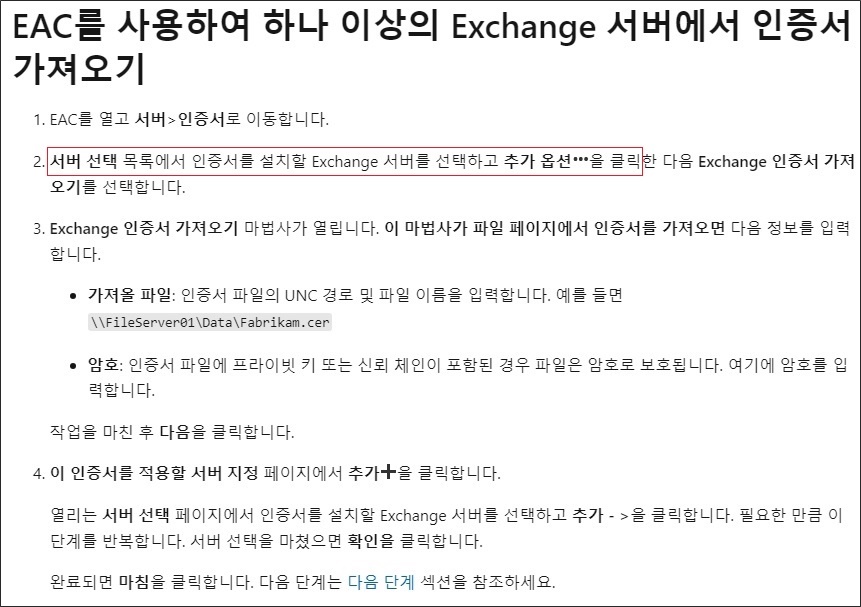 이전에는 다음 MS 사이트 내용과 같이 EAC(Exchange Admin Center)에서 인증서 설치(=가져오기) 작업이 가능 했습니다.