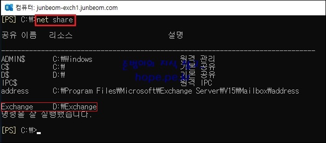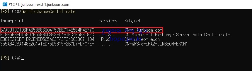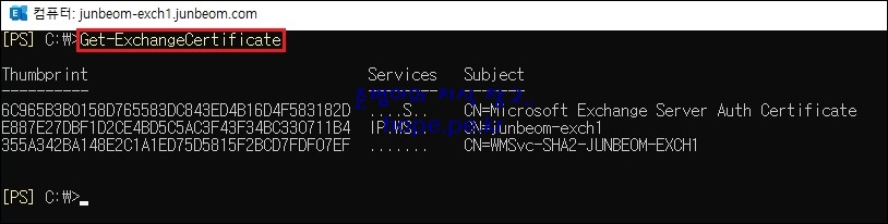다시 다음 명령을 실행하여 Exchange Server에 인증서가 정상적으로 설치되었음을 확인 합니다.