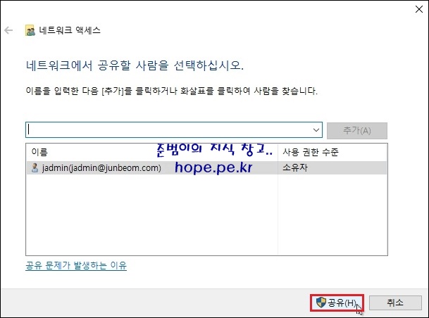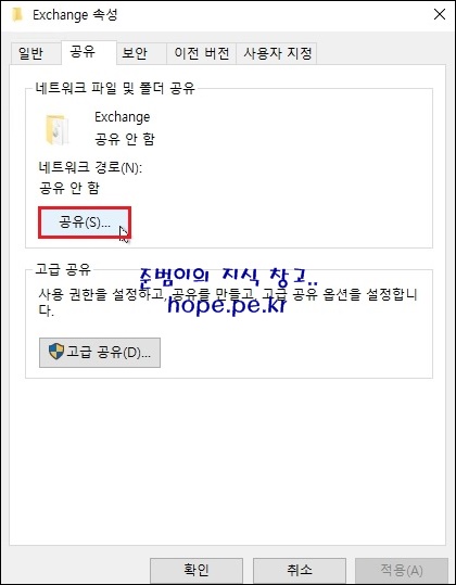 폴더 속성 창에서, '공유' 를 클릭 합니다.