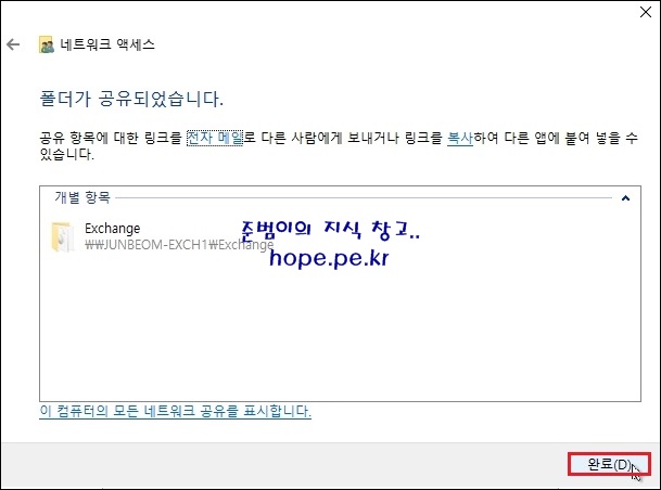 폴더가 공유되었습니다. 메세지 확인 후, '완료' 을 클릭 합니다.