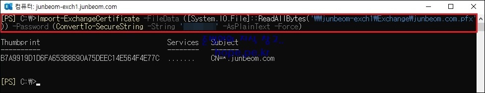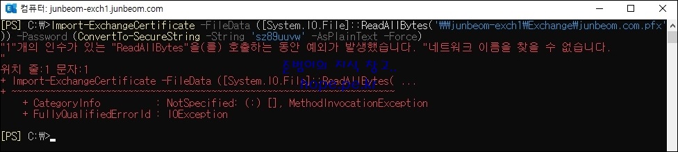 Import-ExchangeCertificate -FileData ([System.IO.File]::ReadAllBytes('\\junbeom-exch1\Exchange\junbeom.com.pfx')) -Password (ConvertTo-SecureString -String 'Password' -AsPlainText -Force)