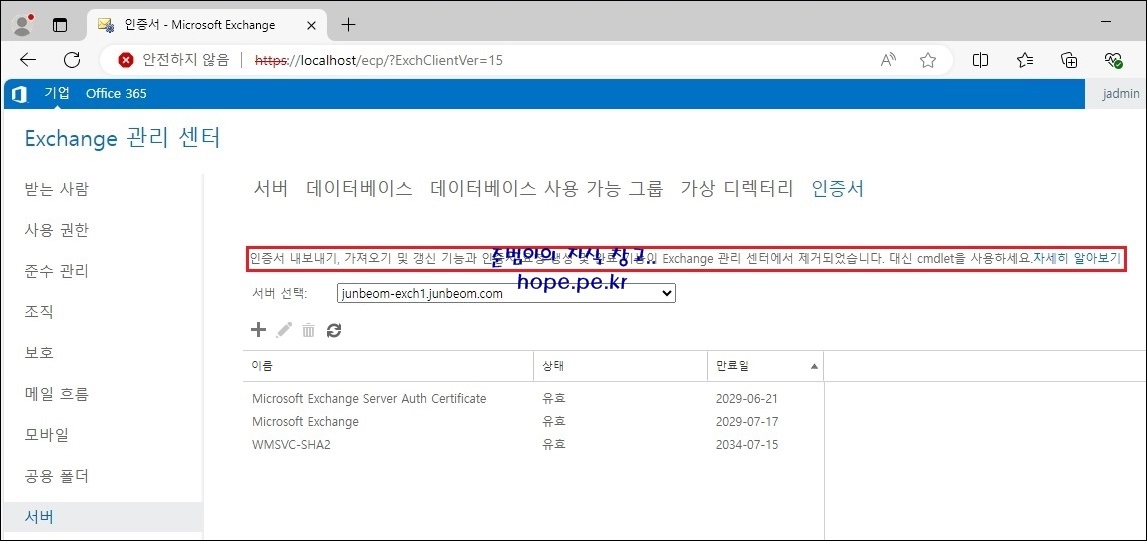 하지만 실제로 'EAC > 서버 > 인증서' 페이지에 접속해보면 다음과 같이, '인증서 내보내기, 가져오기 및 갱신 기능과 인증서 요청 생성 및 완료 기능이 Exchange 관리 센터에서 제거되었습니다. 대신 cmdlet을 사용하세요.' 라는 안내 메세지가 표시 됩니다.