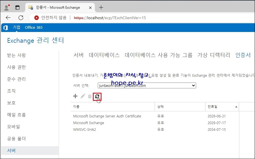 Exchange 관리 센터에서, '새로고침' 을 클릭하여 인증서가 정상적으로 설치되었음을 확인 합니다.