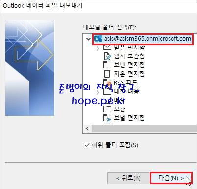 Outlook 데이터 파일 내보내기 화면에서, 내보낼 폴더를 '전체 사서함' 선택 후 '다음' 을 클릭 합니다.