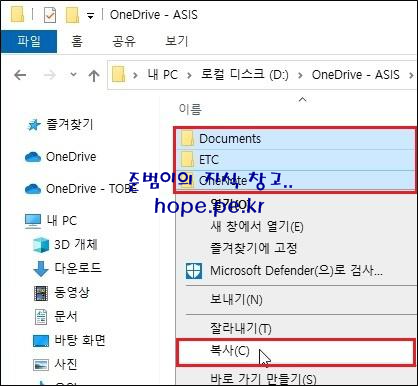ASIS OneDrive 폴더 내 '모든 폴더 및 파일' 을 선택 후 우클릭 하여 '복사' 를 클릭 합니다.