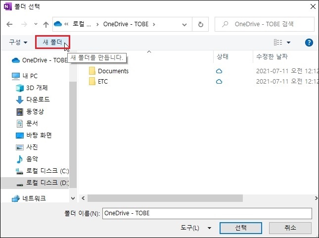 폴더 선택 창에서, TOBE 테넌트 계정의 OneDrive 동기화 폴더에서 '새 폴더' 를 클릭 합니다.