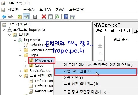 그룹 정책 관리 콘솔로 이동 후, 'USB 차단 그룹 정책을 적용할 OU' 에서 우클릭 후 '기존 GPO 연결' 을 클릭 합니다.