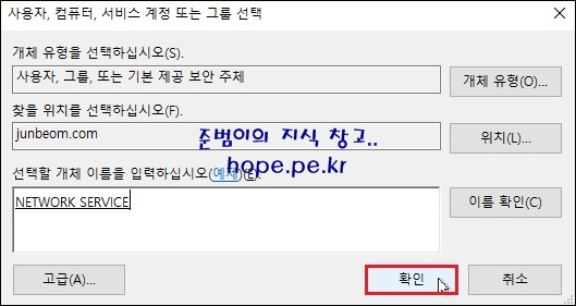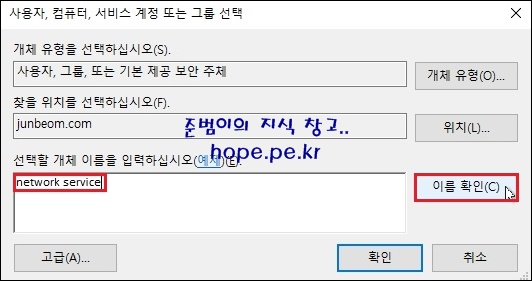 사용자, 컴퓨터, 서비스 계정 또는 그룹 선택 창에서, 선택할 개체 이름을 입력하십시오. 상자에 'network service' 입력 후 '이름 확인' 을 클릭 합니다.