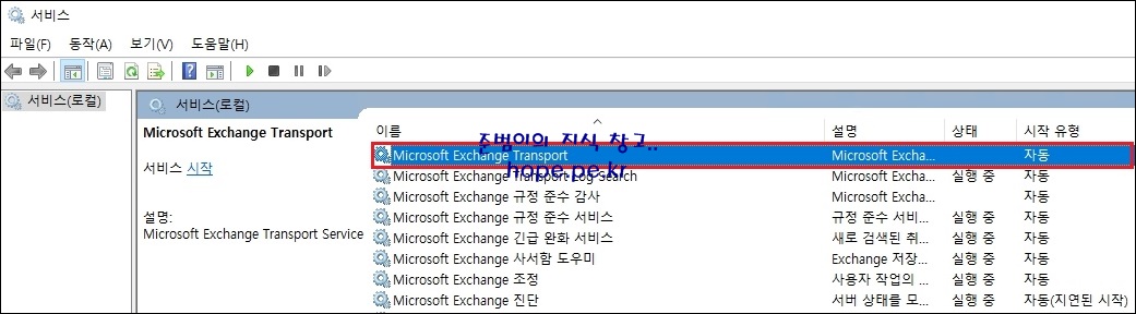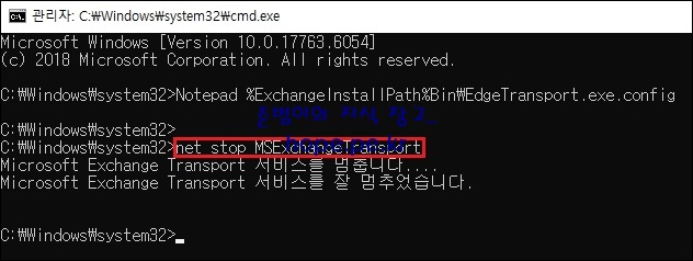 다음 명령을 실행하여, Exchange Transport 서비스를 중지 합니다.