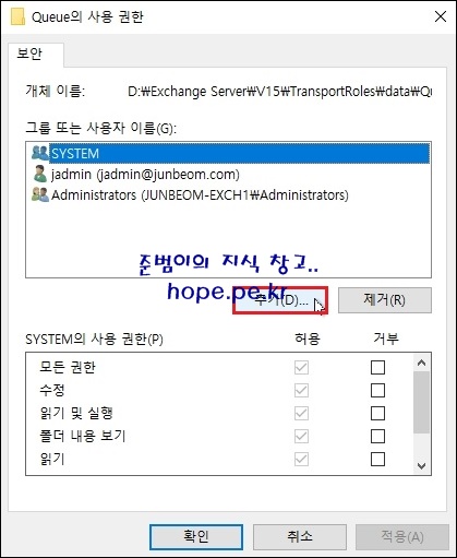 폴더의 사용 권한 창에서, '추가' 를 클릭 합니다.