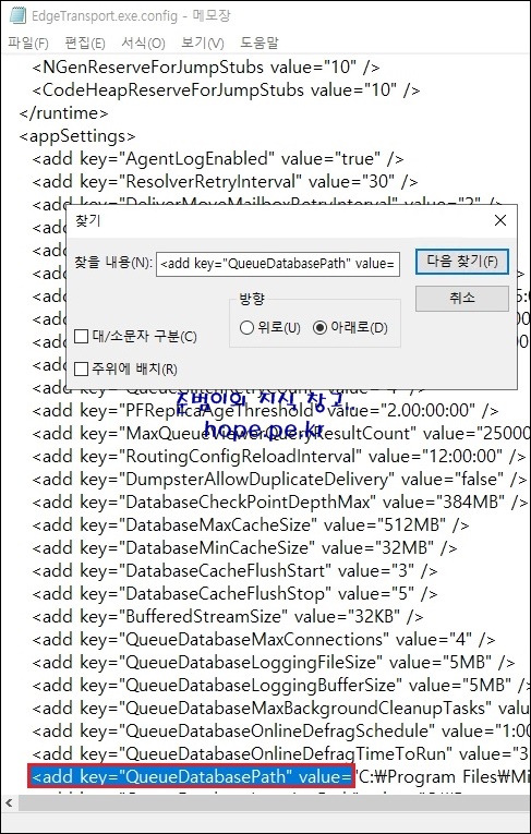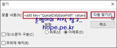 찾을 내용에 '<add key="QueueDatabasePath" value=' 입력 후 '다음 찾기' 를 클릭 합니다.