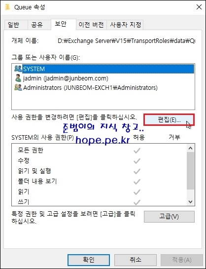 폴더 속성 창에서, '편집' 을 클릭 합니다.