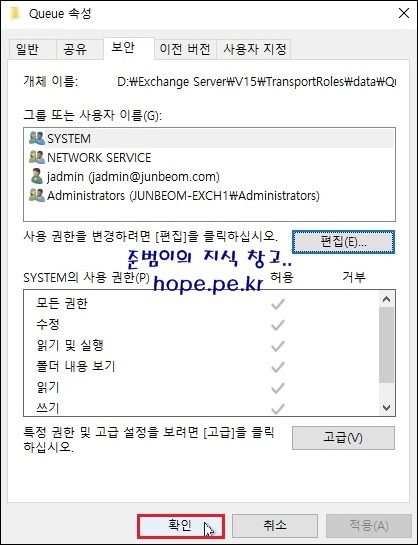cf) 만약 새로운 큐 데이터베이스 폴더에 올바른 권한이 부여되어 있지 않다면, Exchange Transport 서비스가 정상적으로 실행되지 않거나 or 실행되었더라도 곧 중지 상태로 변경될 수 있습니다.
