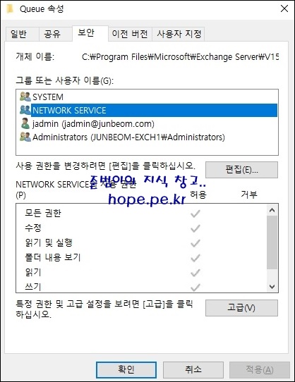 해당 폴더의 권한을 확인해보면, 다음과 같이 일반 폴더에 비해 NETWORK SERVICE 개체에 대한 모든 권한이 추가되어 있음을 확인할 수 있습니다.