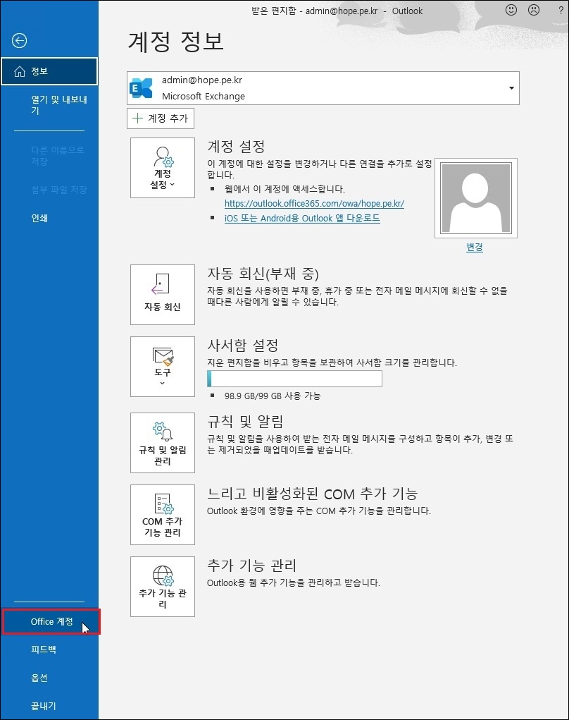 'Office 계정' 을 클릭합니다.
