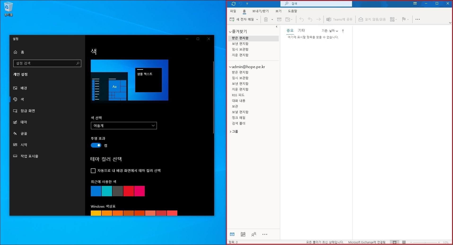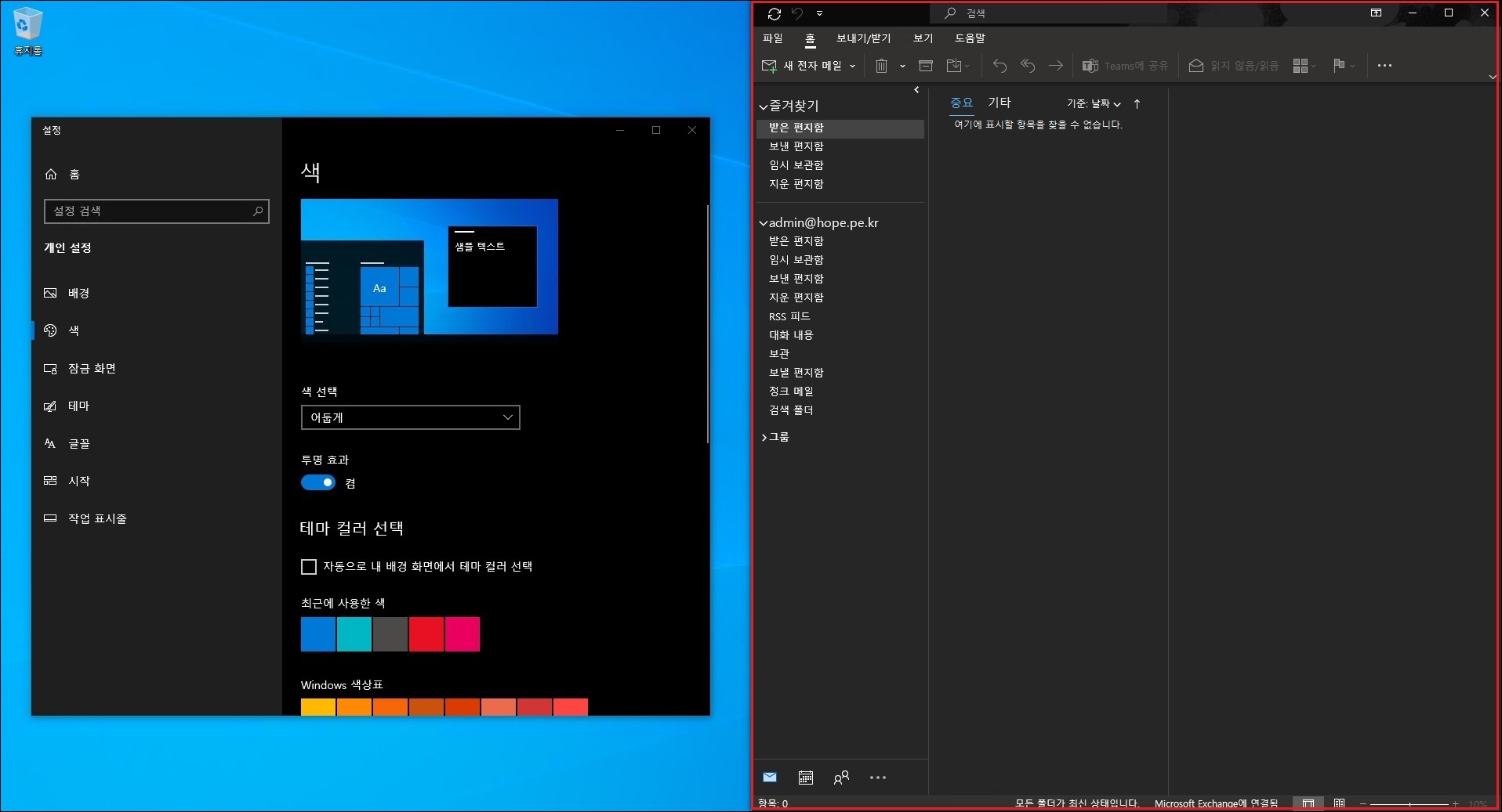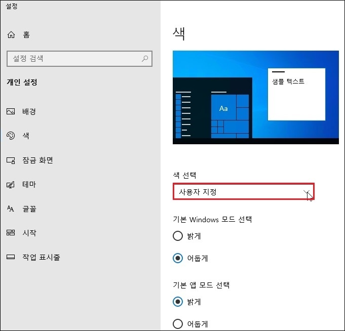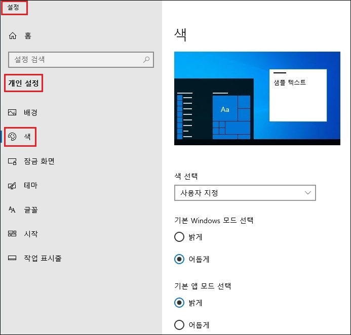 Windows 10에서 다크모드는 'Windows 설정 > 개인 설정 > 색' 메뉴에서 설정하면 됩니다.