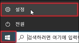 첫번째 방법으로, '시작' 버튼 클릭후 '설정' 을 클릭합니다.