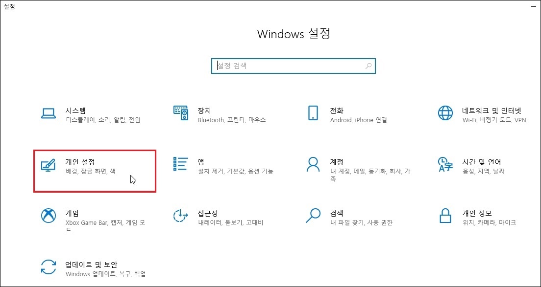 Windows 설정 창에서, '개인 설정' 을 클릭합니다.