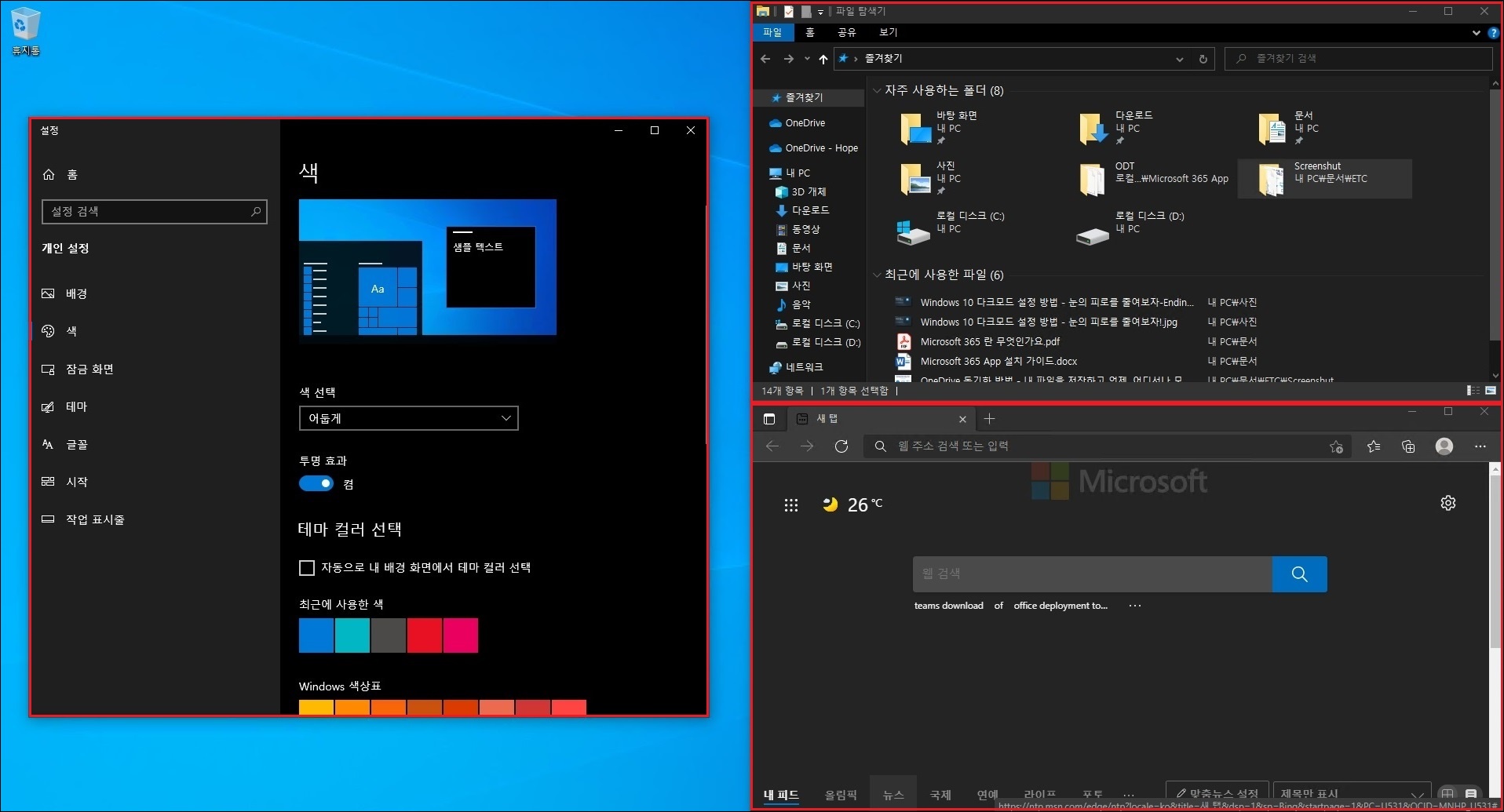 그러면 'Windows 설정' 창 및 우측상단의 '파일 탐색기' 창 그리고 우측하단의 'Edge 브라우저' 창까지 어두운색으로 변경되면서 다크모드가 몇번의 클릭만으로 간단하게 적용되었습니다.