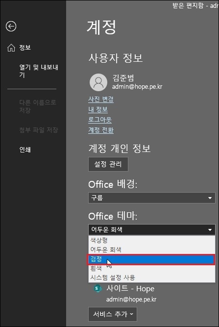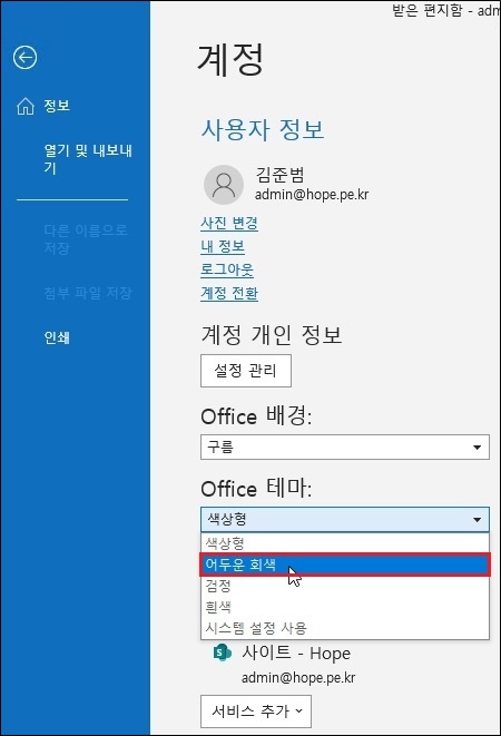 Office 테마' 에서 '어두운 회색' 을 클릭합니다.
