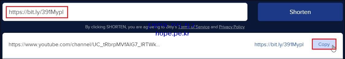 페이지 하단의 'Shorten your link' 입력 상자에 복사한 YouTube 주소를 붙여넣기후 'Shorten' 을 클릭 합니다.