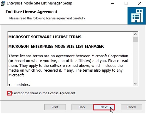 Enterprise Mode Site List Manager Setup 창에서, 'Next' 를 클릭 합니다.