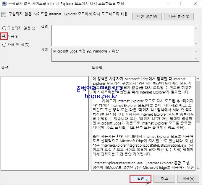 구성되지 않은 사이트를 Internet Explorer 모드에서 다시 로드하도록 허용 창에서, '사용' 선택후 '확인' 을 클릭 합니다.