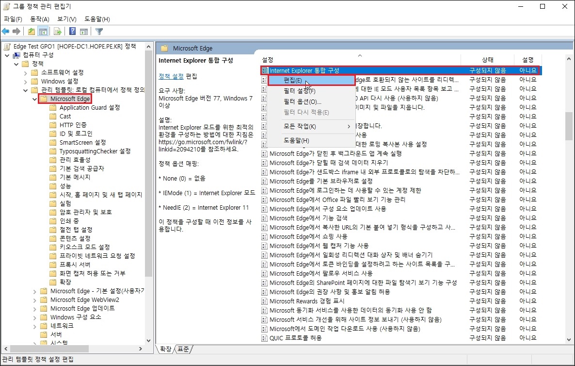 그룹 정책 관리 편집기 콘솔에서, '컴퓨터 구성 > 정책 > 관리 템플릿 > Microsoft Edge' 의 'Internet Explorer 통합 구성' 에서 우클릭후 '편집' 을 클릭 합니다.