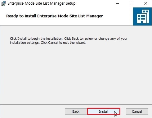 Ready to install Enterprise Mode Site List Manager 화면에서, 'Install' 을 클릭 합니다.