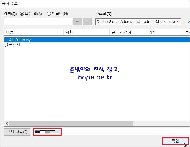 규칙 주소 창에서 '알림 받기를 원하는 조직원' 을 더블 클릭 후 '확인' 을 클릭 합니다.