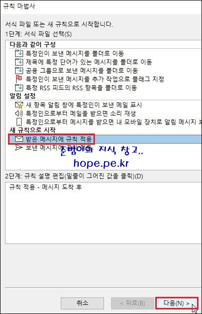 규칙 마법사 창의 첫화면에 있는 규칙을 클릭후 바로 사용해도 되고, '다음' 을 클릭하여 원하는 조건으로 규칙을 생성할 수도 있습니다.