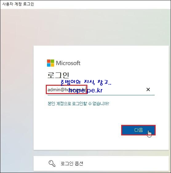 사용자 계정 로그인 창이 발생 합니다. 로그인 화면에서, '계정' 입력후 '다음' 을 클릭 합니다.