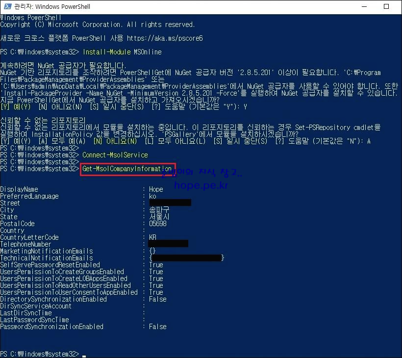 관리자:Windows PowerShell 창에서, Install-Module MSOnline 입력 > NuGet 공급자를 설치할지 묻는 메세지가 표시되면 Y 입력 > PSGallery에서 모듈을 설치할지 묻는 메세지가 표시되면 A 를 입력 합니다.