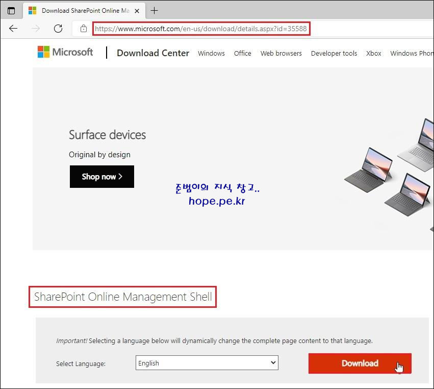 SharePoint Online Management Shell 다운로드 사이트(https://www.microsoft.com/en-us/download/details.aspx?id=35588) 접속후 'Download' 를 클릭 합니다.