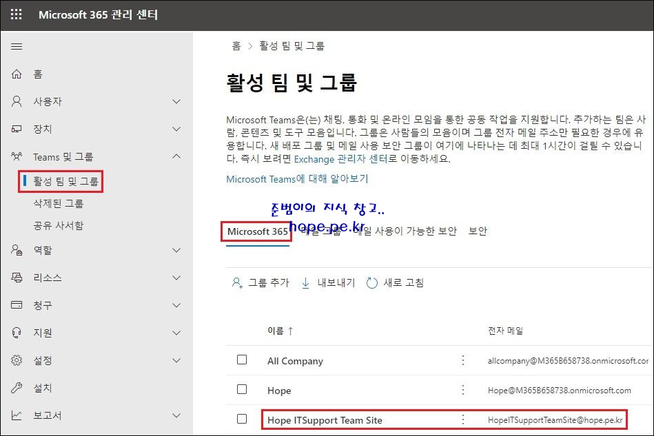 Microsoft 365 관리 센터에서, 해당 팀사이트 이름으로 Microsoft 365 Groups도 정상적으로 잘 생성 되었음을 확인 합니다.