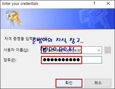 Enter your credentials 창에서, '전역 관리자 계정 정보' 입력후 '확인' 을 클릭 합니다.