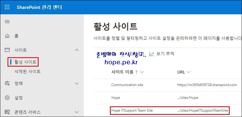 SharePoint 관리 센터에서, 해당 팀사이트가 정상적으로 잘 생성 되었음을 확인 합니다.