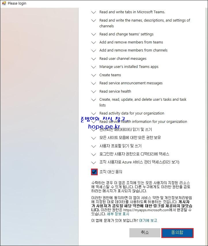 '조직 대신 동의' 에 체크후 '동의함' 을 클릭 합니다.