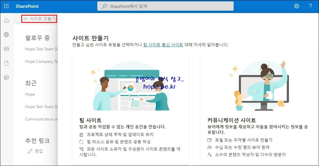 해당 팀사이트에 잘 생성 되었는지 접속해보겠습니다. 잘~ 만들어졌습니다.