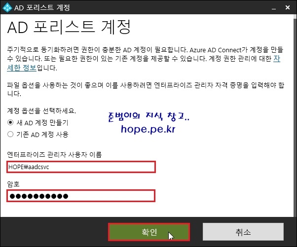 AD 포리스트 계정 창에서, 사전에 생성한 'Azure AD Connect 서비스 계정' 및 '암호' 입력후 '확인' 을 클릭 합니다.
