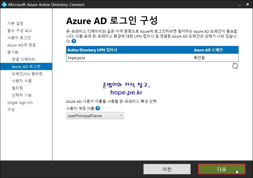 Azure AD 로그인 구성 화면에서, Active Directory UPN 접미사가 Azure AD 도메인에 확인됨 메세지를 확인후 '다음' 을 클릭 합니다.