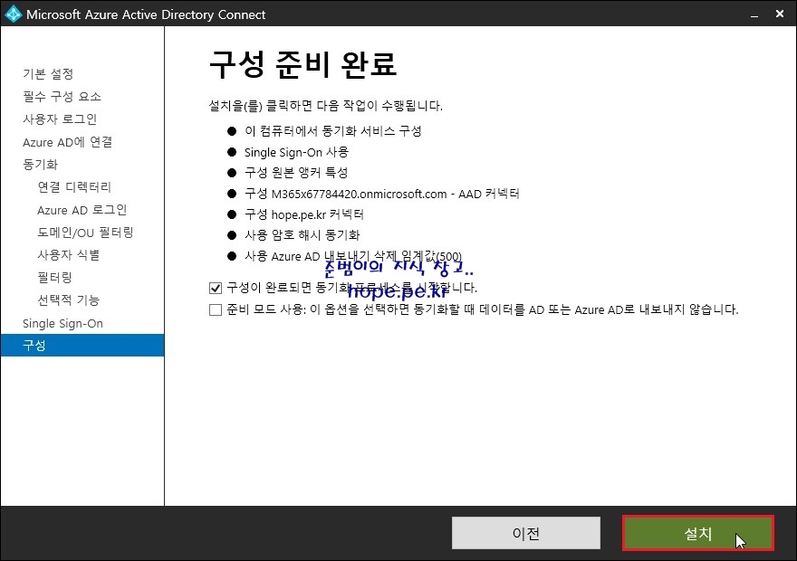 Cf) 본 포스팅에서는 Azure AD Connect 설치를 사용자 지정의 기본 옵션으로 간단한 설치를 진행 하였습니다. 설치 과정중 다양한 옵션에 대한 자세한 설명은 'Azure Active Directory Connect 사용자 지정 설치' 사이트 내용을 참고 부탁 드립니다.