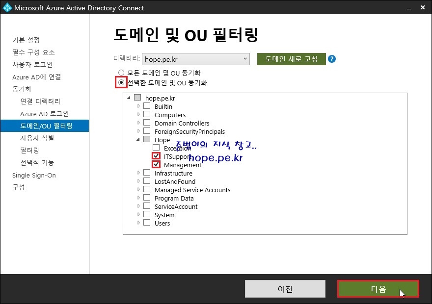 도메인 및 OU 필터링 화면에서, 동기화를 진행하고자 하는 OU 선택후 '다음' 을 클릭 합니다.