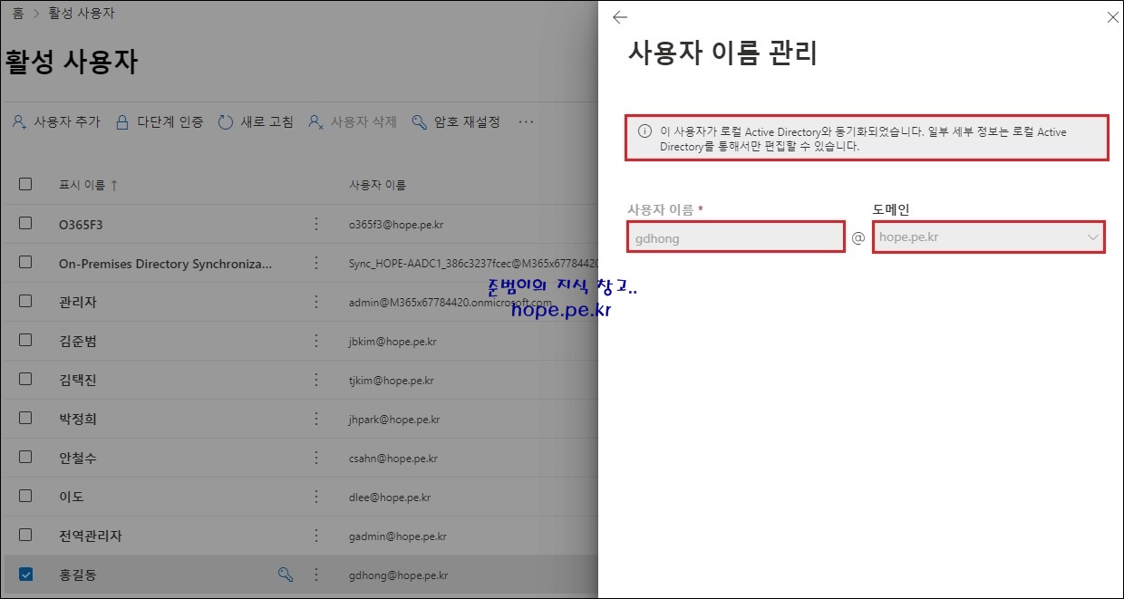 '이 사용자가 로컬 Active Directory와 동기화되었습니다. 일부 세부 정보는 로컬 Active Directory를 통해서만 편집할 수 있습니다.' 라는 경고메세지가 표시됩니다.
