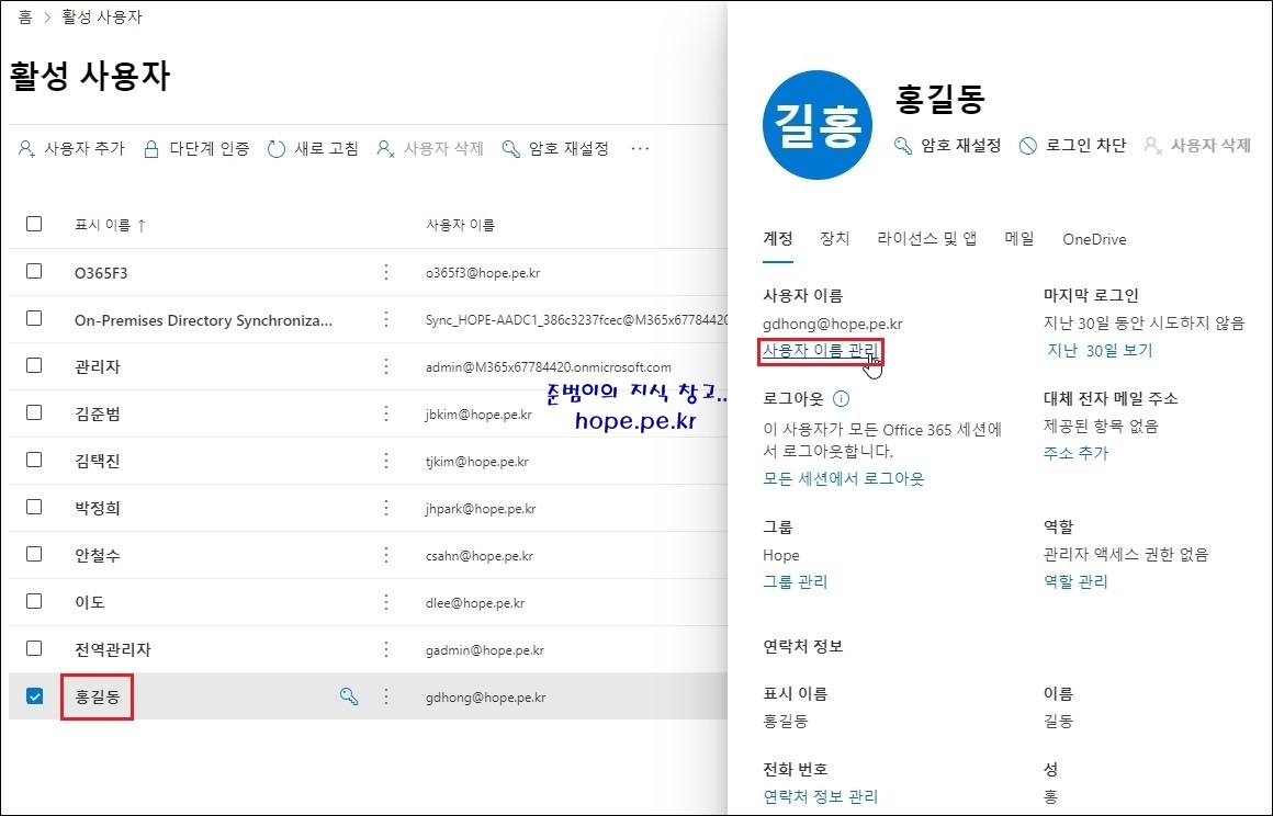 동기화 된 사용자의 Microsoft 365 라이선스는 수동으로 부여해야 하며, '해당 사용자' 클릭후 '사용자 이름 관리' 를 클릭해보면