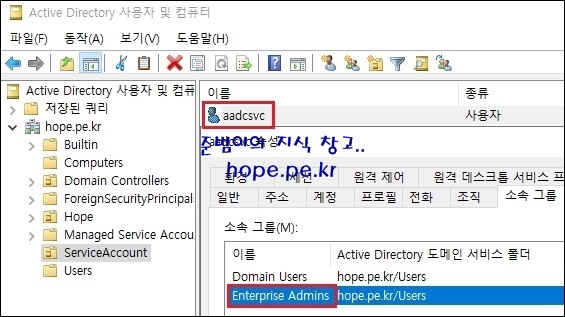 먼저 Azure AD Connect 설치 과정중에, Enterprise Admins 권한을 가진 서비스 계정이 필요 합니다.